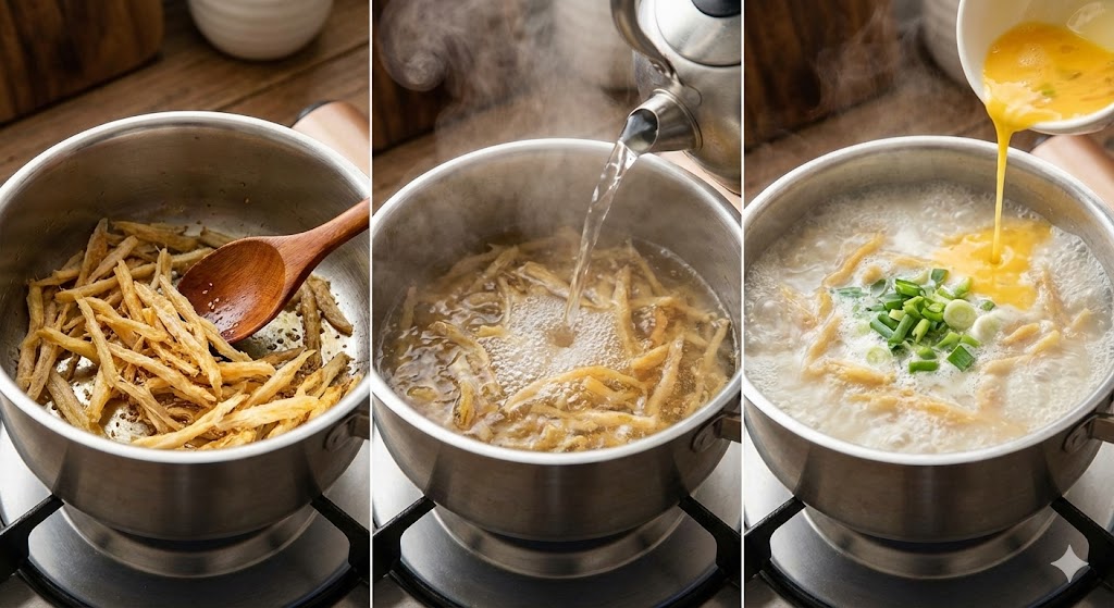 3️⃣ 북어가 노릇해지면 물을 붓고 끓입니다. (약 10분)