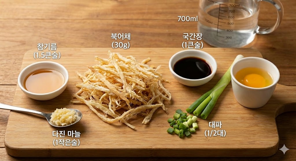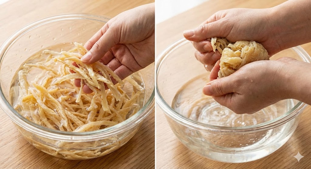 1️⃣ 북어채는 물에 살짝 적셔 부드럽게 만든 후, 물기를 꼭 짜주세요.
