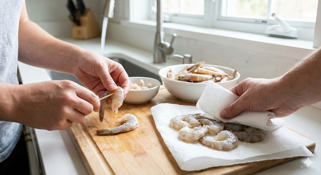 새우는 껍질 벗기고 내장 제거한 뒤, 한 번 헹궈서 키친타올로 물기 제거!