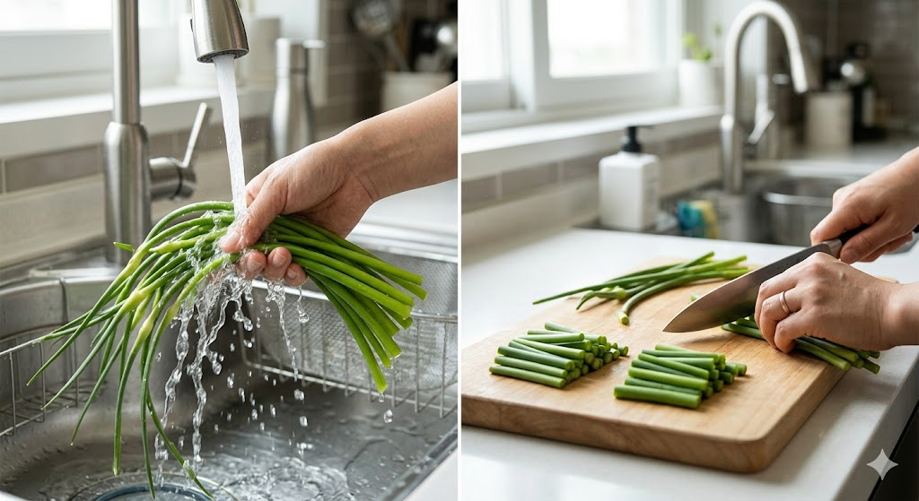 마늘종은 흐르는 물에 깨끗이 씻은 뒤 4~5cm 길이로 잘라줍니다.