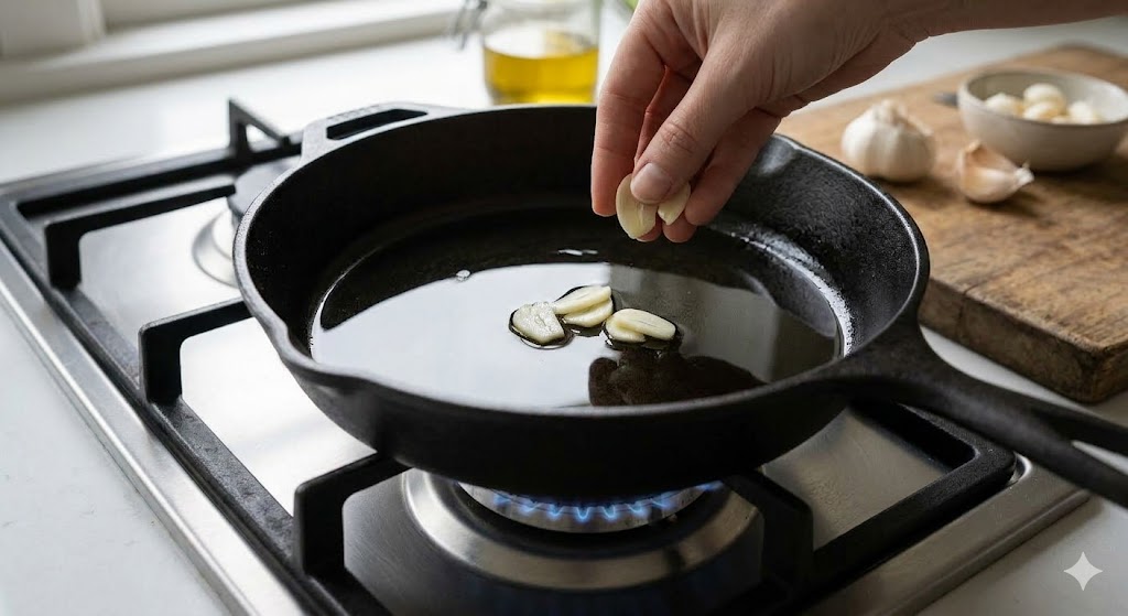 팬에 마늘이 너무 많으면 고르게 익지 않습니다.