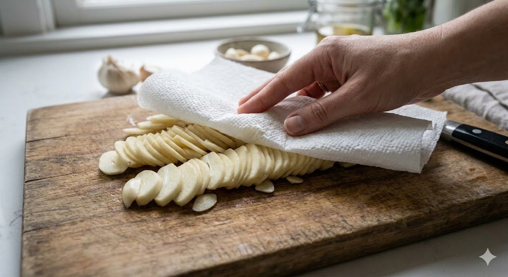 썬 마늘을 키친타월 위에 펼쳐 5~10분 정도 두거나, 위에서 한 번 더 가볍게 눌러 수분을 없앱니다.