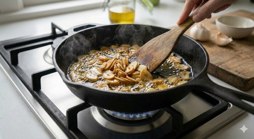 대부분 불이 세거나, 마늘 두께가 너무 얇거나, 팬을 오래 달군 상태에서 시작했기 때문입니다.