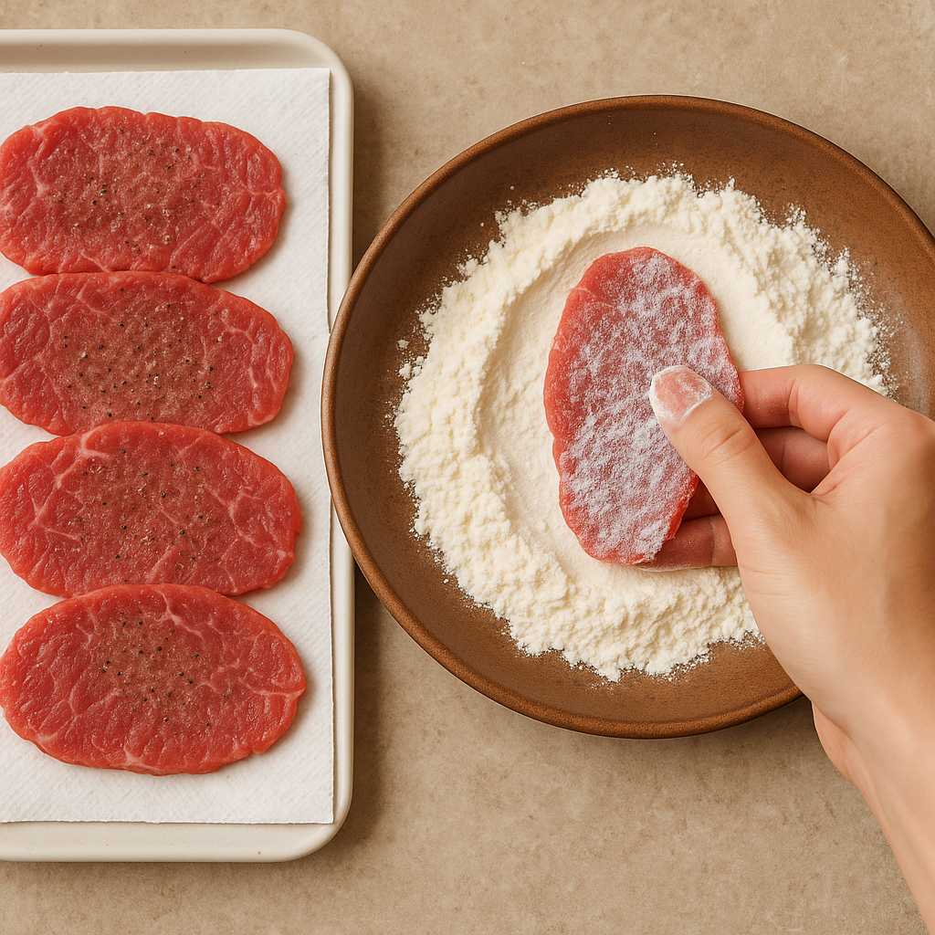 - 고기 양면에 밀가루를 얇게 묻혀주세요.