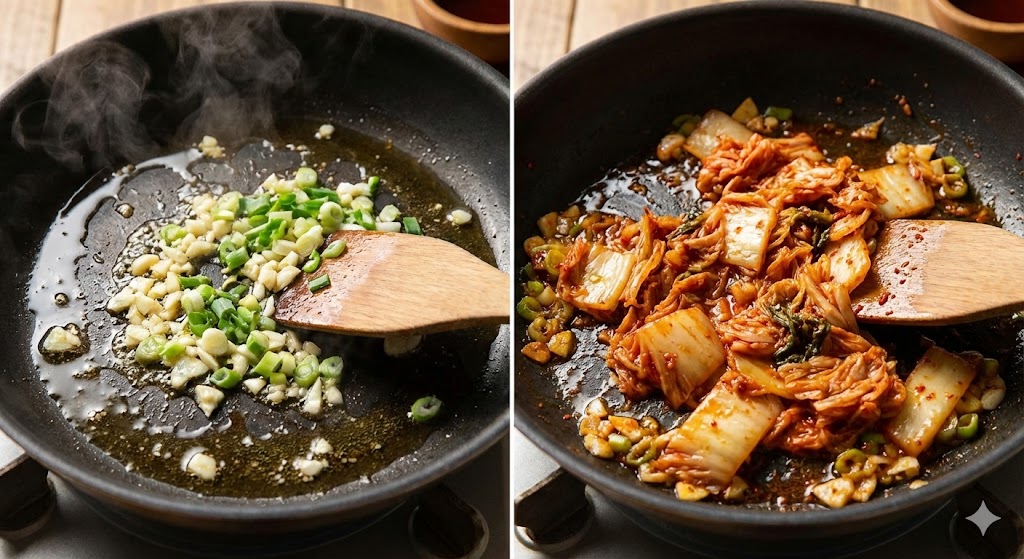 - 팬에 참기름을 두르고 다진 마늘, 대파를 먼저 볶아 향을 내주세요.