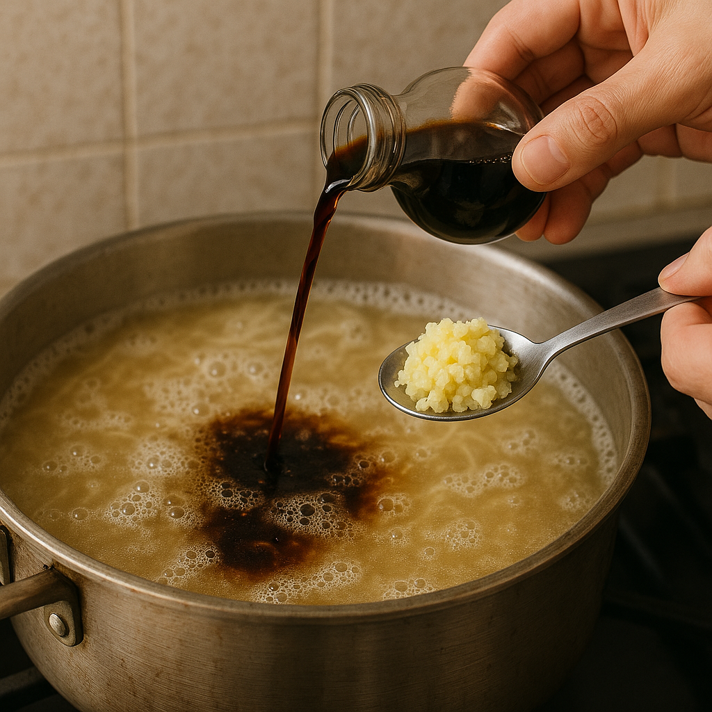 - 건더기를 걸러낸 후, 간장과 다진 마늘로 간을 맞춰줍니다.