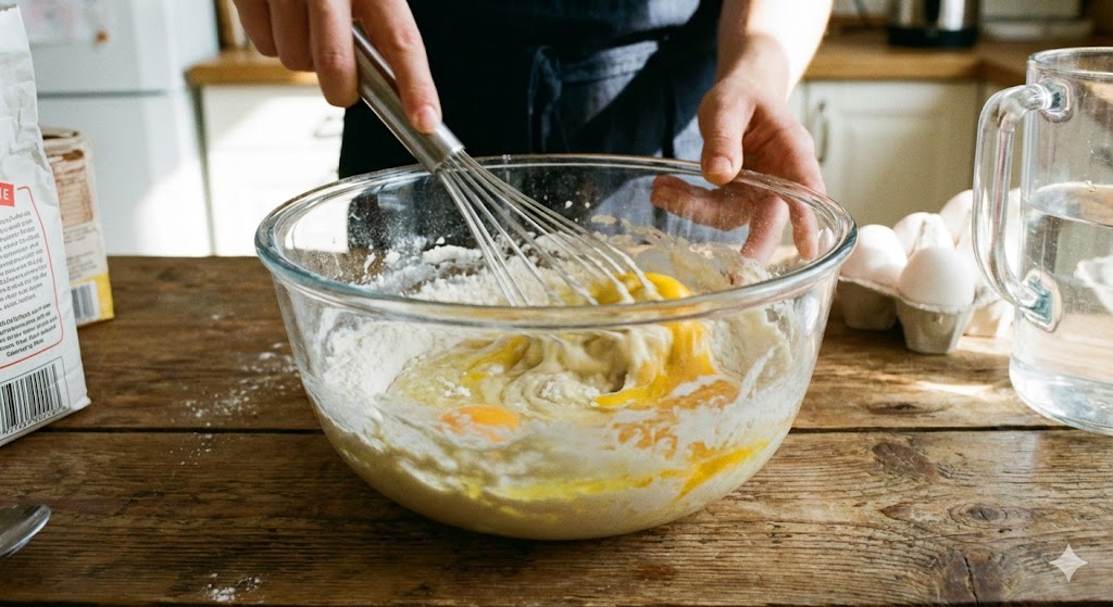 볼에 부침가루와 물, 계란을 넣고 잘 섞어주세요. 반죽은 너무 묽지 않게, 약간 되직한 느낌이 좋아요!