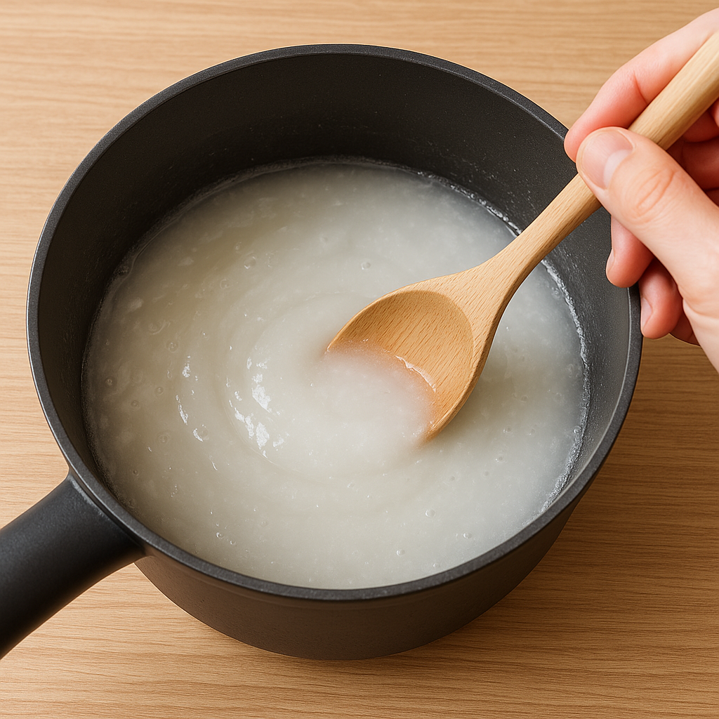 - 찹쌀가루 2큰술 + 물 1컵을 저어가며 끓여 찹쌀풀을 만듭니다.