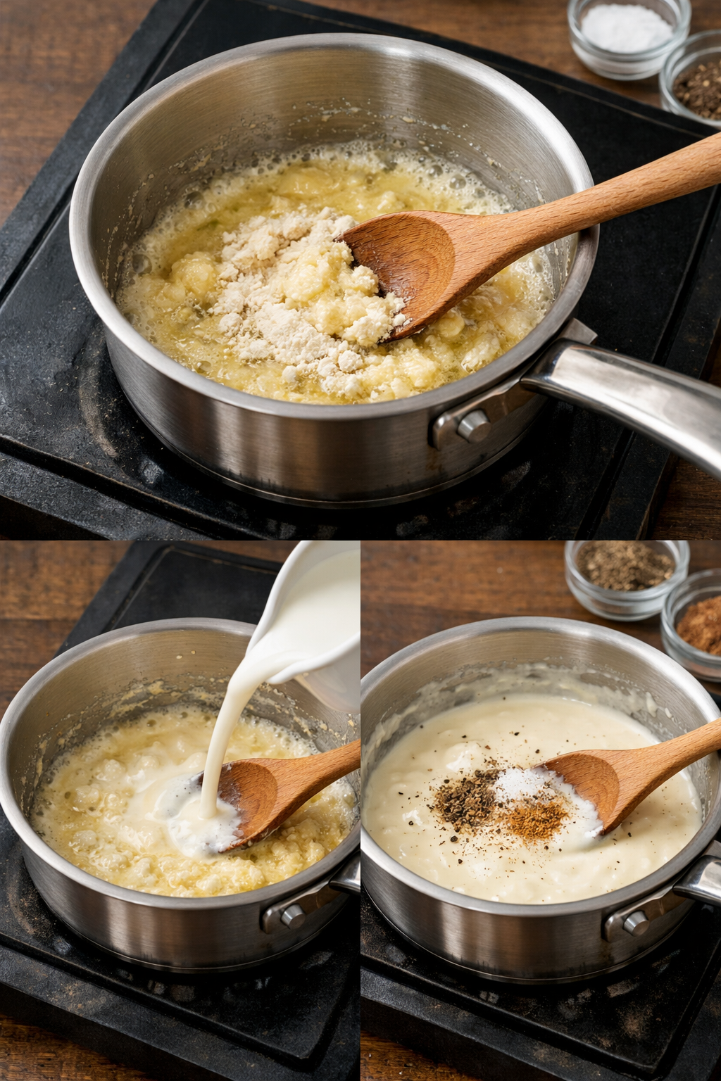 작은 냄비에 버터를 녹인 후 밀가루를 넣고 약불에서 루를 만든 뒤, 우유를 조금씩 부어가며 잘 저어줍니다. 소금, 후추, 넛맥으로 간을 하고 되직한 소스가 되면 불을 끕니다.