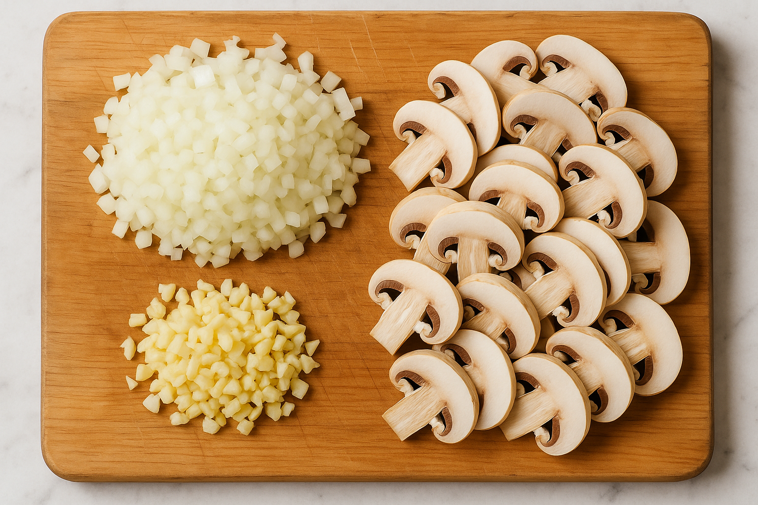 • 양파와 마늘은 잘게 다지고, 버섯은 슬라이스합니다.