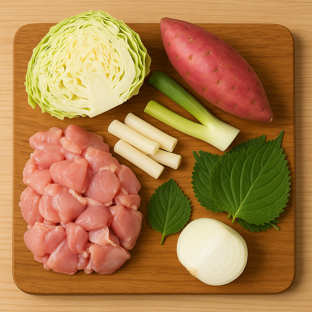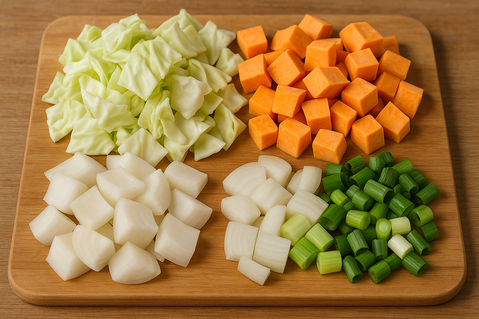 양배추, 고구마, 양파, 대파 등 야채를 한 입 크기로 썰어 준비합니다.