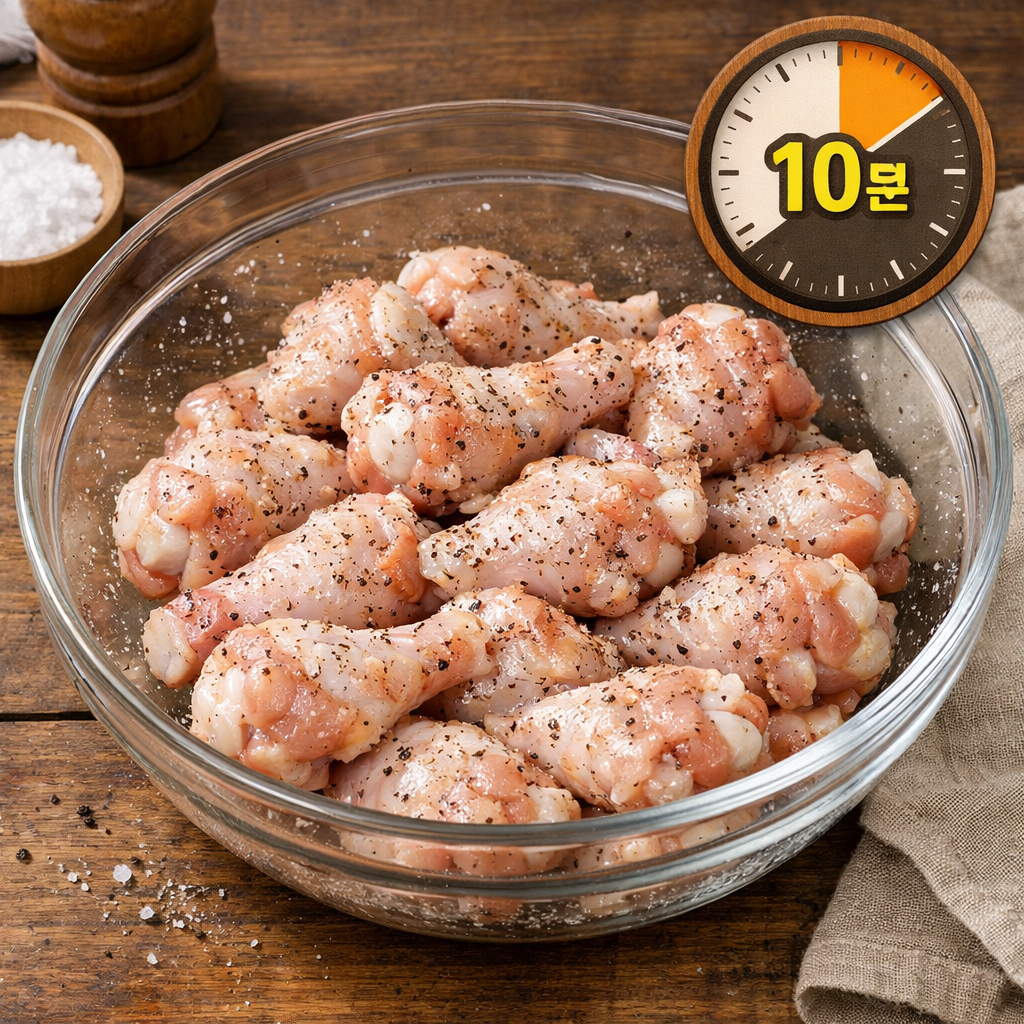 닭봉 500g에 청주 2T, 소금, 후추로 밑간 후 10분 재워둡니다.