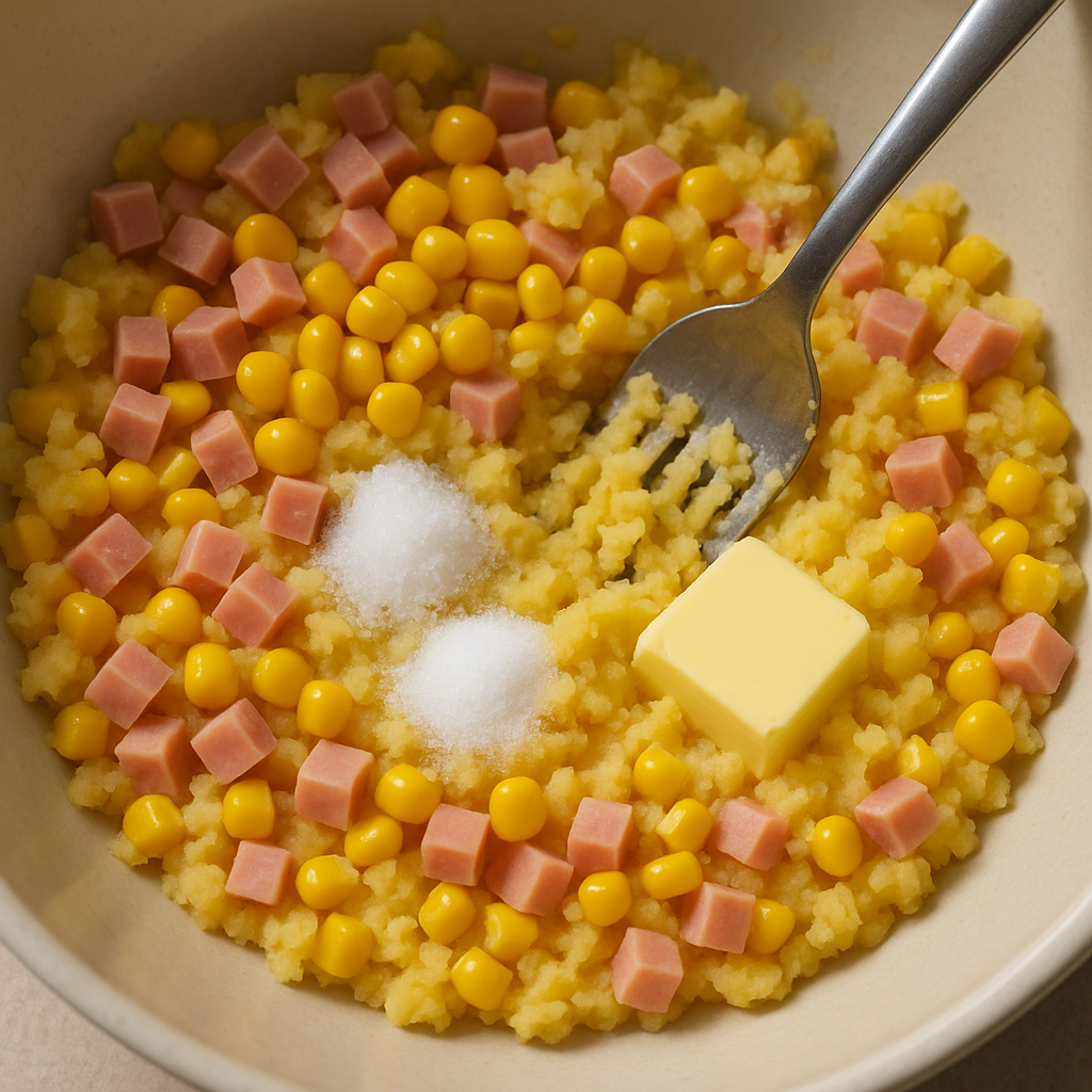 - 치즈, 옥수수, 다진 햄 등 원하는 부재료를 넣고 반죽을 완성합니다.