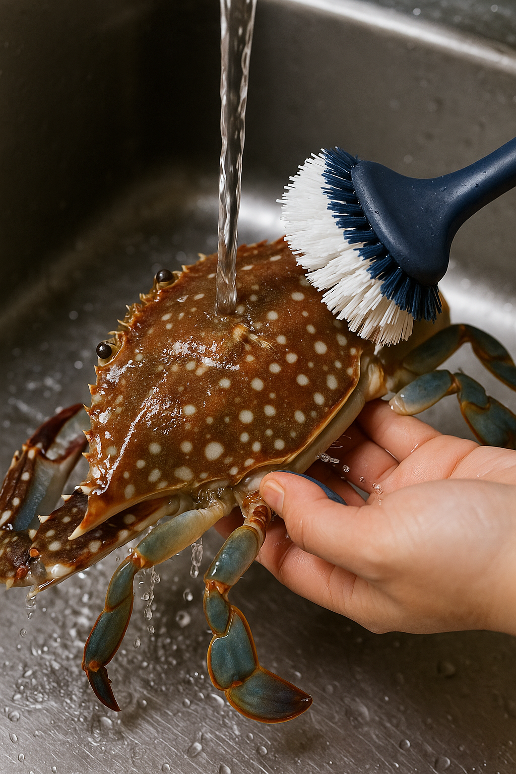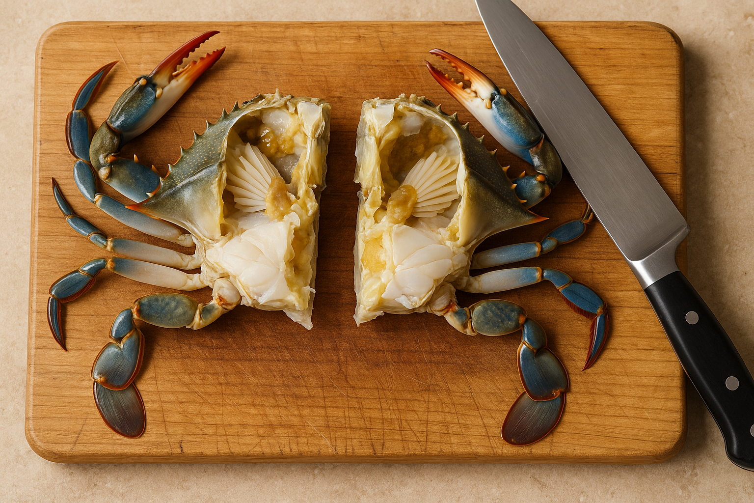 - 등껍질을 열고 아가미와 모래주머니를 제거한 후 반으로 잘라줍니다.
