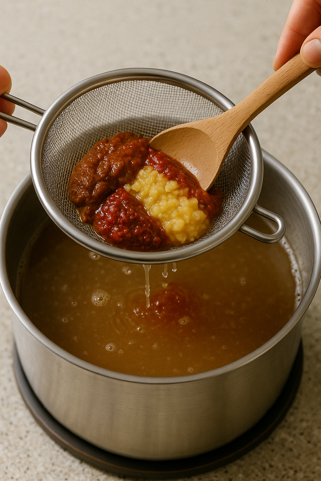 - 육수에 된장 2큰술, 고추장 0.5큰술, 다진 마늘 1큰술을 풀어줍니다. 체에 걸러주면 더 깔끔해요.