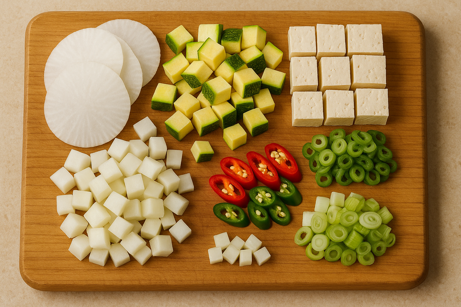 - 무는 얇게 나박썰기, 애호박·양파·두부는 깍둑 썰기, 고추는 어슷썰기, 대파는 송송 썰기.