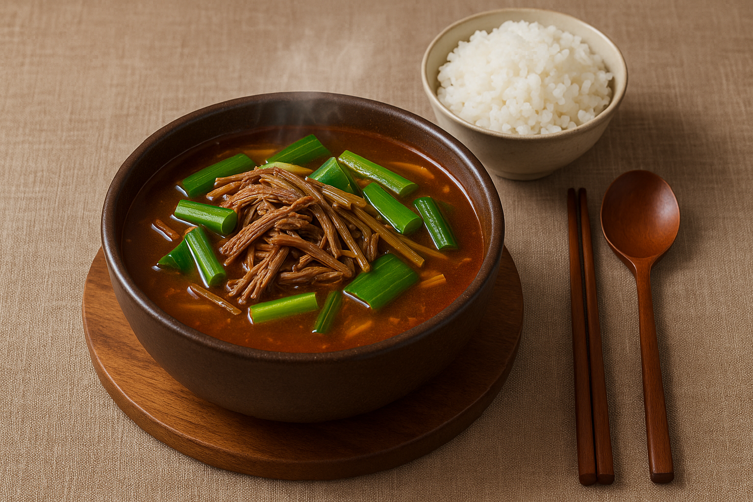 ✅ 대표 재료: 소고기(양지), 고사리, 숙주, 대파, 고춧가루, 마늘 등