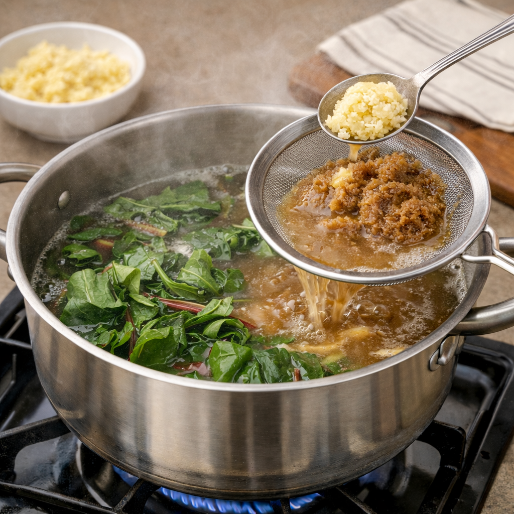 끓인 육수에 된장을 체에 걸러 풀어 넣으면 깔끔한 국물이 완성됩니다.