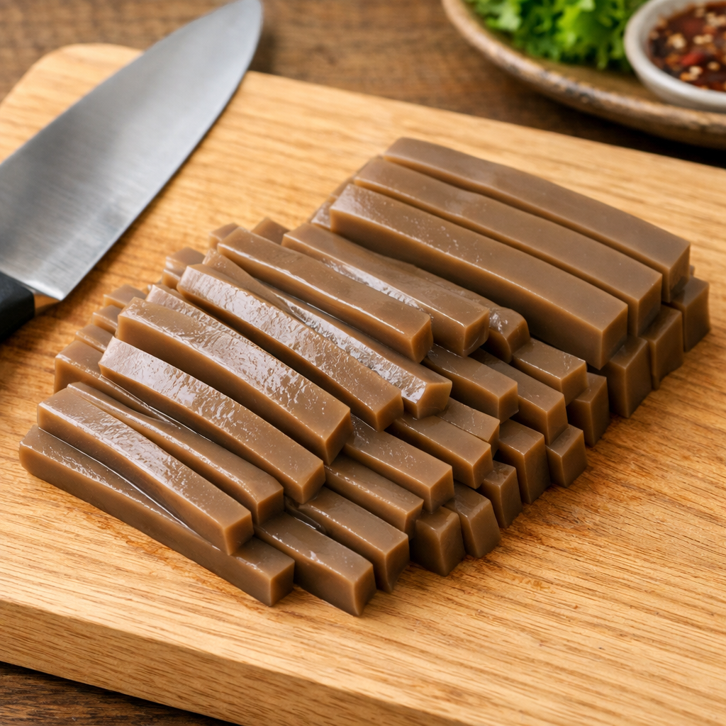 도토리묵은 먹기 좋은 두께로 채 썰어주세요. 너무 얇으면 부서지기 쉬우니 약간 도톰하게 써는 것이 좋아요.