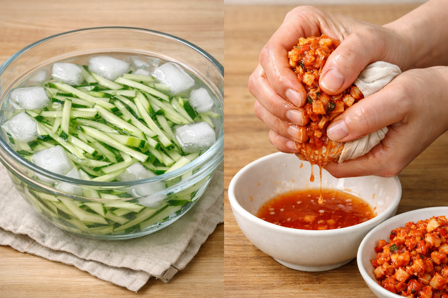 오이는 채 썰어 찬물에 담가 아삭함을 살리고,
