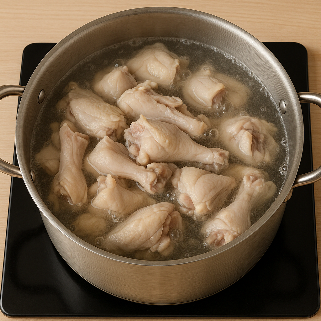 - 잡내 제거를 위해 끓는 물에 닭을 2~3분 데친 후 찬물에 헹굽니다.