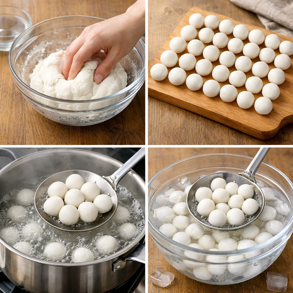 - 찹쌀가루에 물을 넣고 반죽해 지름 1.5cm 정도로 동글동글하게 빚기