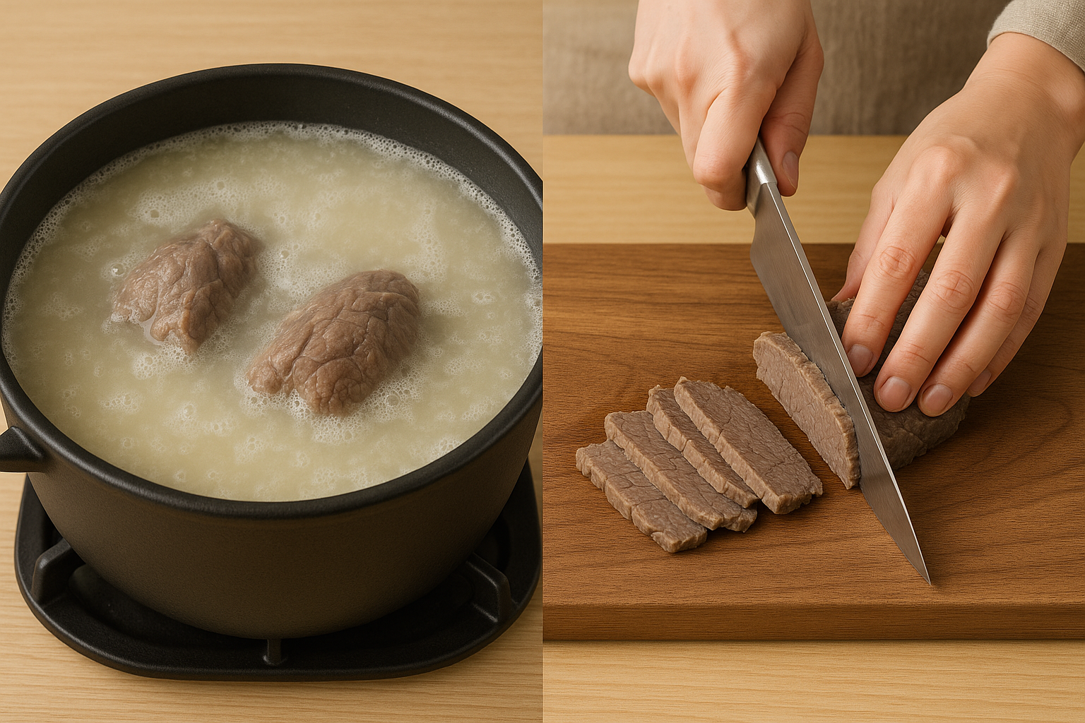 - 양지는 적당히 익으면 먼저 건져서 결 반대 방향으로 얇게 썰기