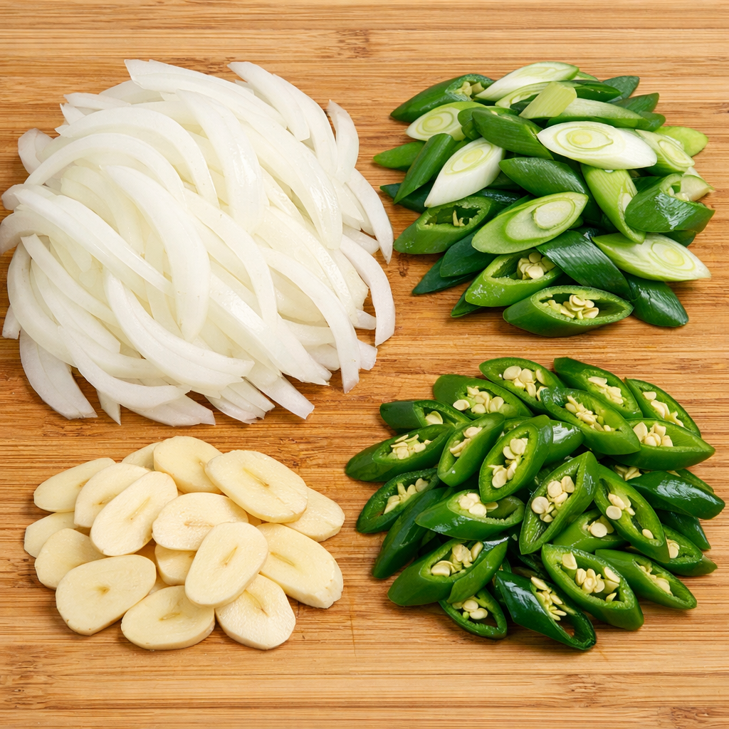 - 양파는 채 썰고, 대파와 청양고추는 어슷 썰기