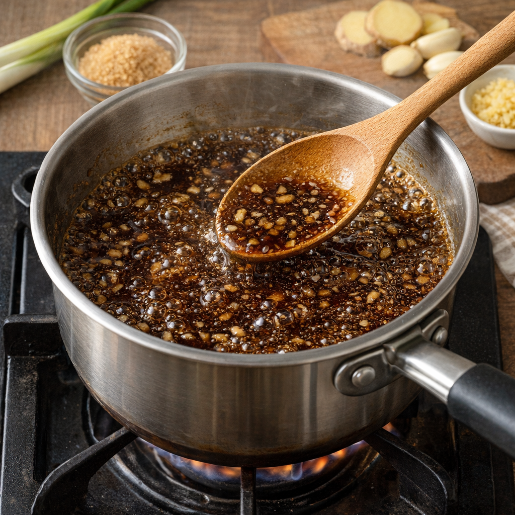 간장, 설탕, 미림, 물, 다진 마늘, 생강즙을 모두 섞어 중불에 끓이며 소스를 만들어줍니다.
