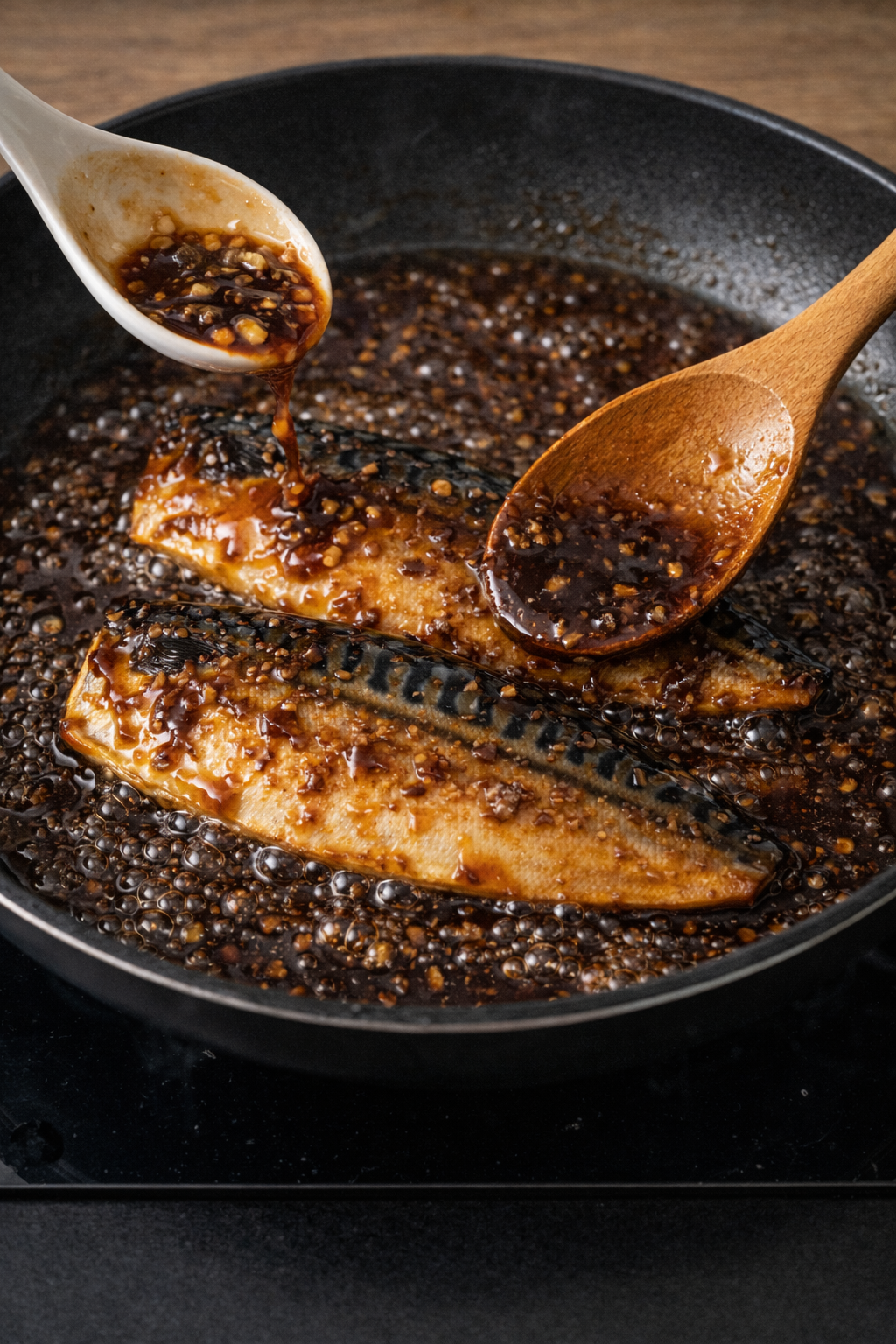 고등어가 거의 익으면 만들어둔 데리야끼 소스를 넣고 약불에서 졸여가며 양면에 골고루 입혀줍니다.
