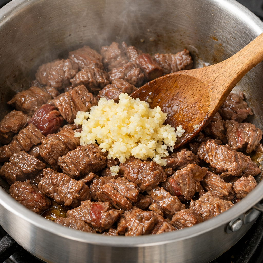 • 냄비에 참기름 → 소고기 넣고 중불에서 볶기