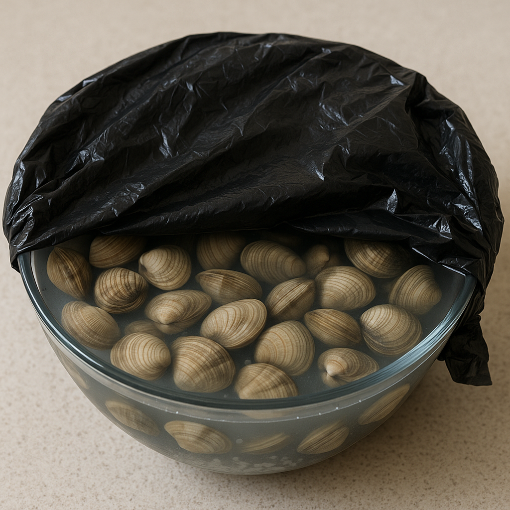 - 모시조개 담그기: 조개를 넣고 검은 비닐봉지나 신문지로 덮어 어둡게 만든 뒤 3~4시간 두세요.