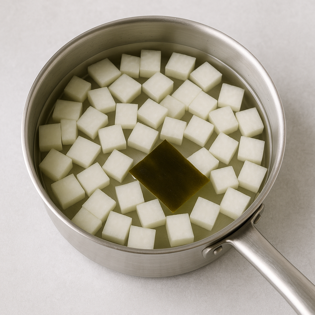 - 냄비에 물 1L와 무를 나박나박 썰어 넣고 다시마를 함께 넣습니다.