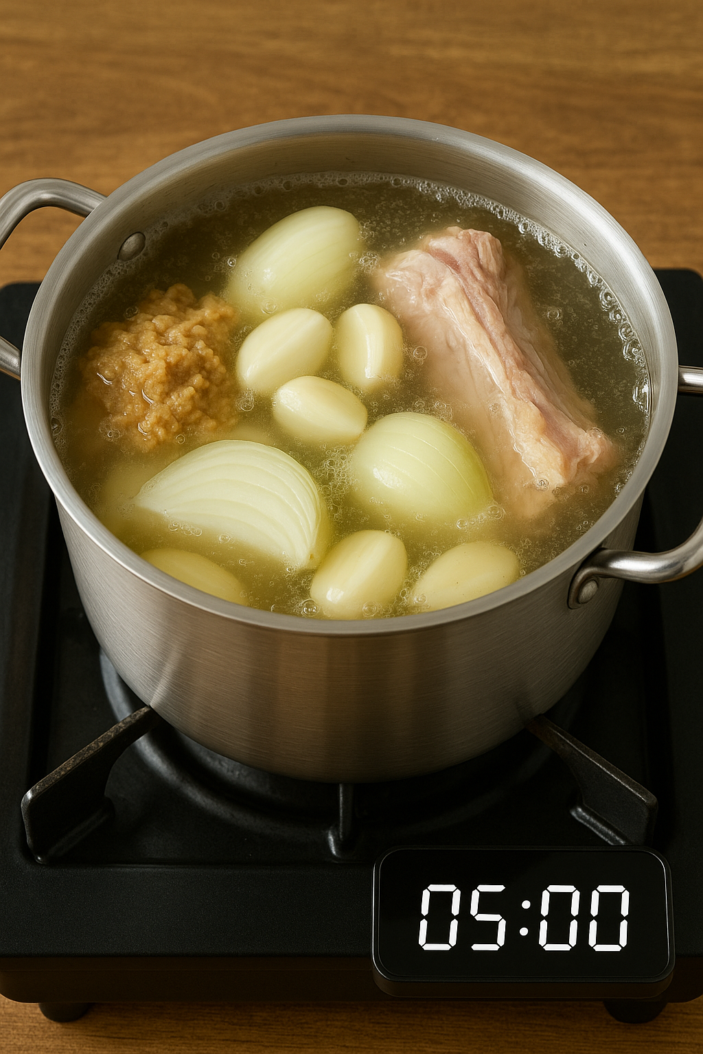• 끓는 물에 된장 1큰술, 양파, 마늘 넣고 등뼈를 5분간 데쳐주세요.