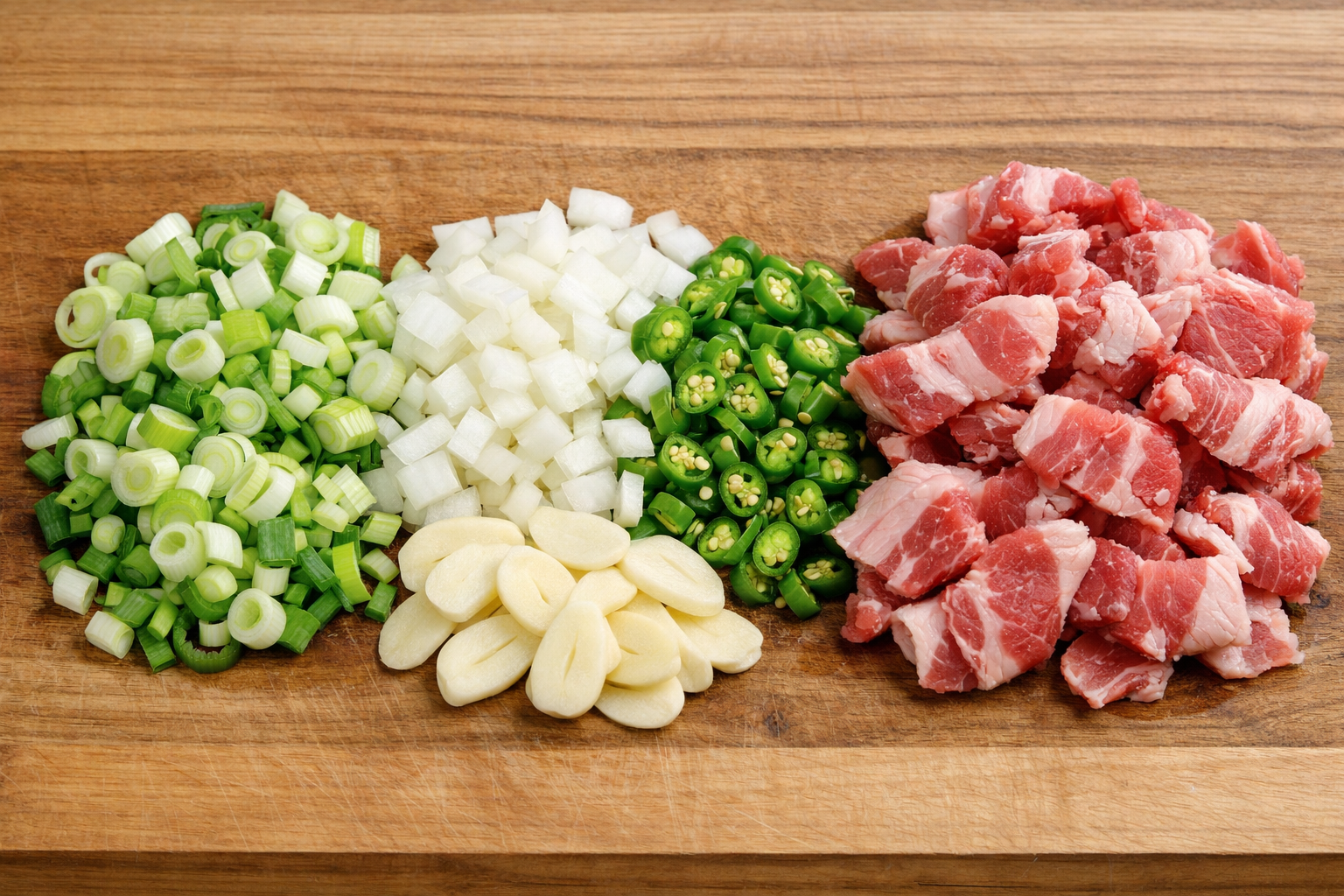 A. 삼겹살, 소불고기용 고기도 잘 어울려요. 다만 기름 함량에 따라 볶는 시간은 조절하세요.