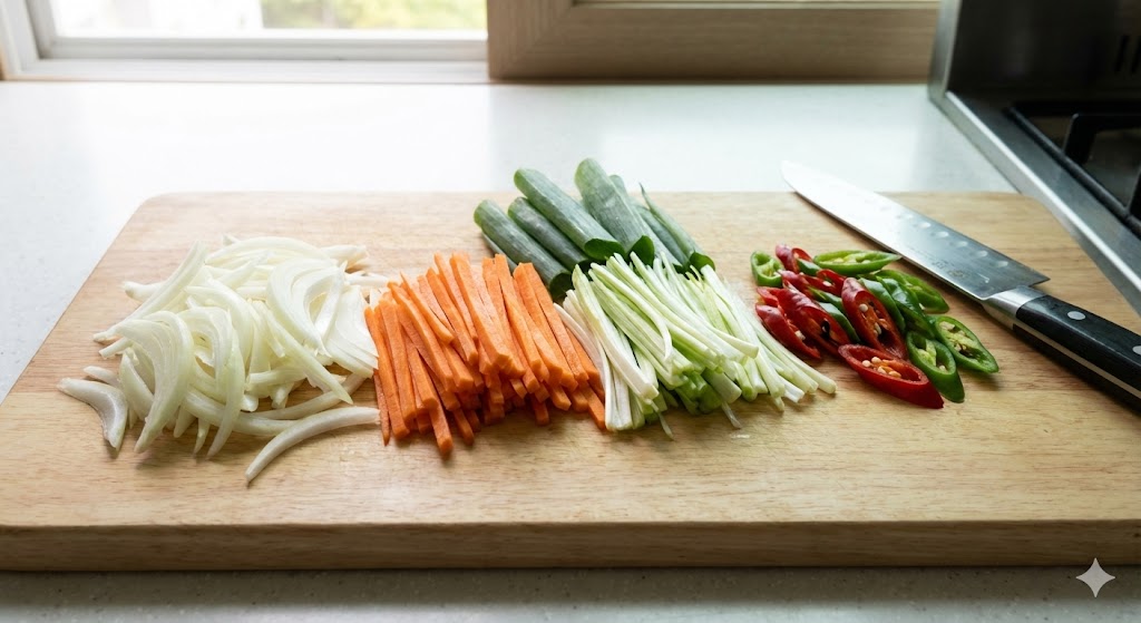 - 양파, 당근, 대파는 채 썰고, 청양고추는 어슷하게 썰어요.