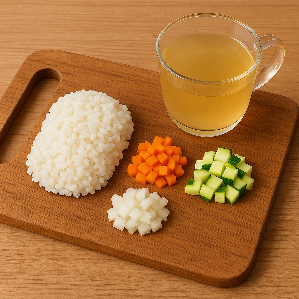 **야채리조또는 쌀(탄수화물)·채소(비타민 & 식이섬유)·육수(단백질 미량·미네랄)**을 한 번에 섭취할 수 있어 영양 균형 면에서 아주 좋은 메뉴입니다.