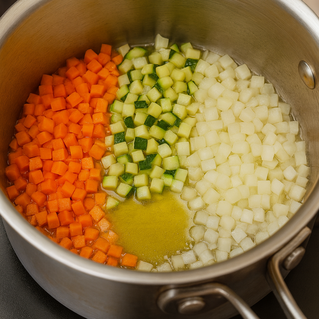 작은 냄비에 채소를 넣고 물 한 숟가락 또는 육수 한 숟가락과 함께 약불로 1~2분 볶아 단맛을 살립니다.