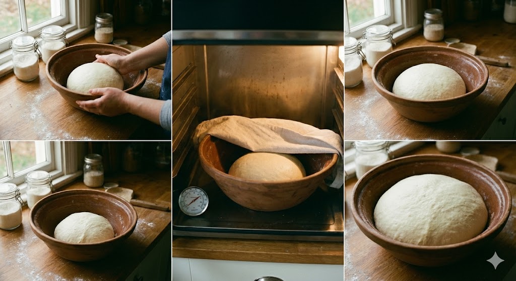 반죽을 둥글게 만들어 따뜻한 곳(약 30℃)에서 1시간 정도 발효시킵니다.