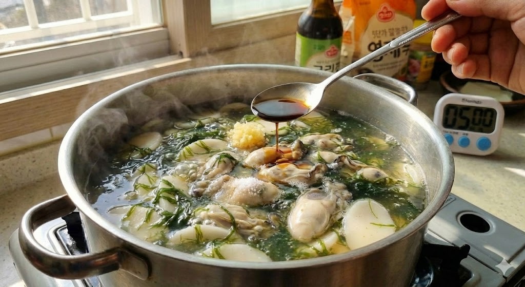 육수가 끓기 시작하면 떡과 굴을 넣고 중불에서 5분간 끓입니다.