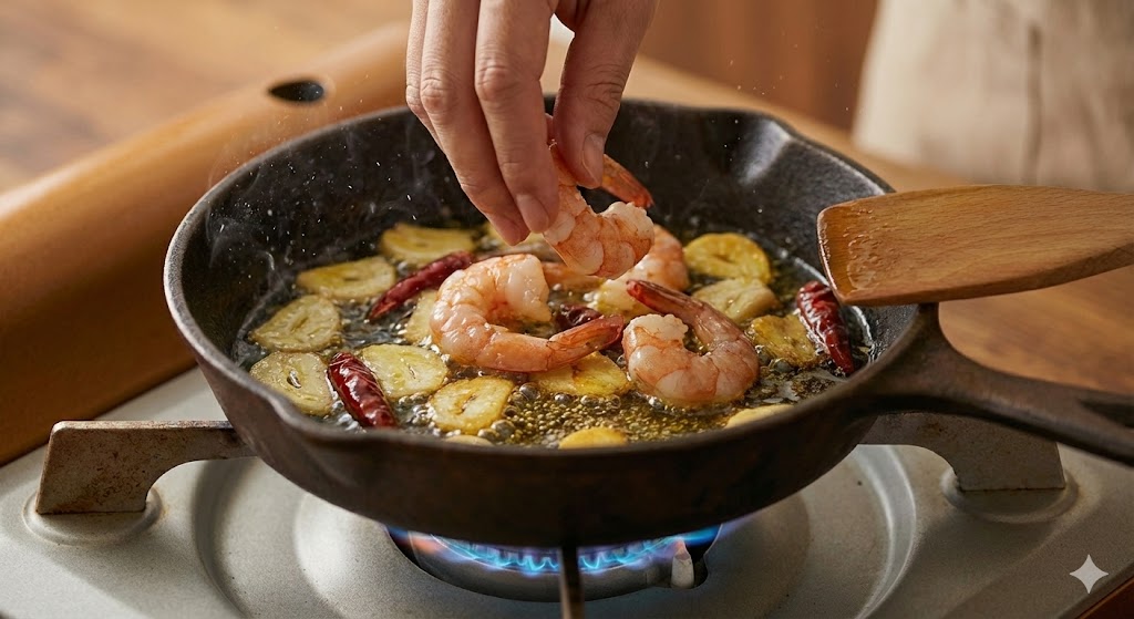 - 마늘 향이 올라오면 새우 투입