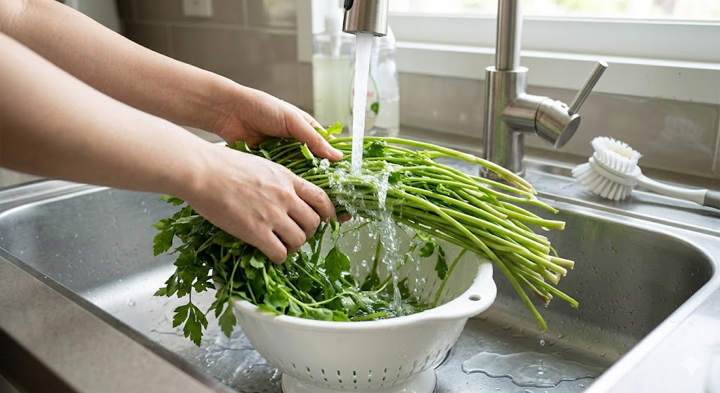 1️⃣ 미나리를 흐르는 물에 2~3번 깨끗하게 씻기