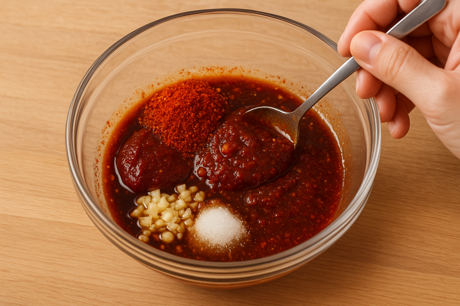 - 고추장, 고춧가루, 간장, 설탕, 다진 마늘을 잘 섞어 미리 양념장을 준비해 주세요.